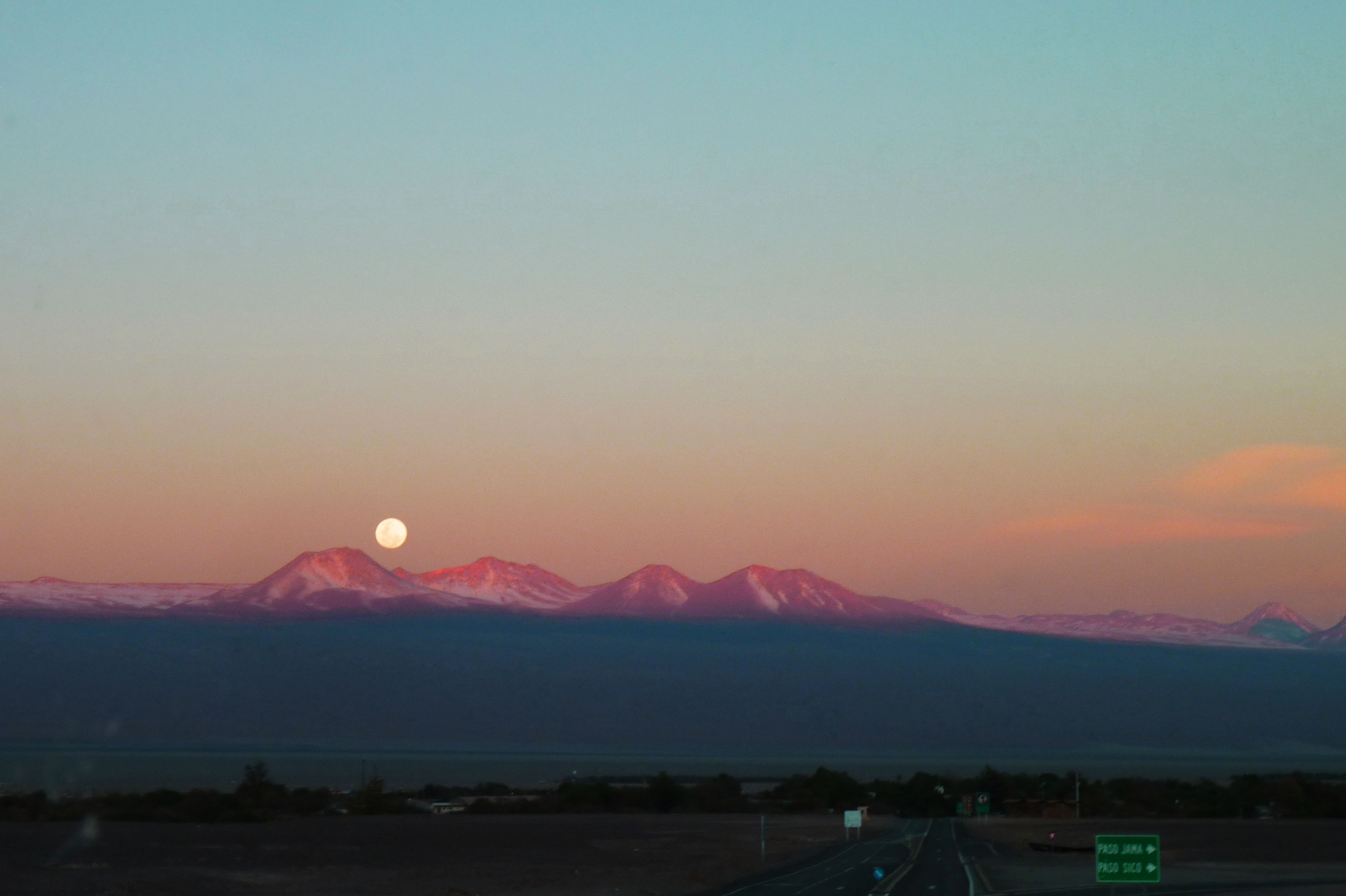 Mostly, the only note worth making was the rolling into San Pedro as the sun was setting behind us. As I’d opted for the upper level window seat, I had complete views of the colored sky as we rolled over the orangey red hills. Right in front of me rose a fantastic full moon aside the perfect cone of Volcan Licanibur, both bright against the sinking canvas.