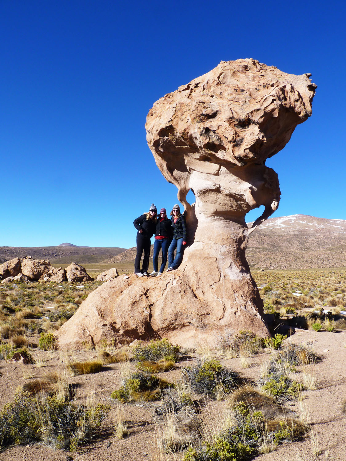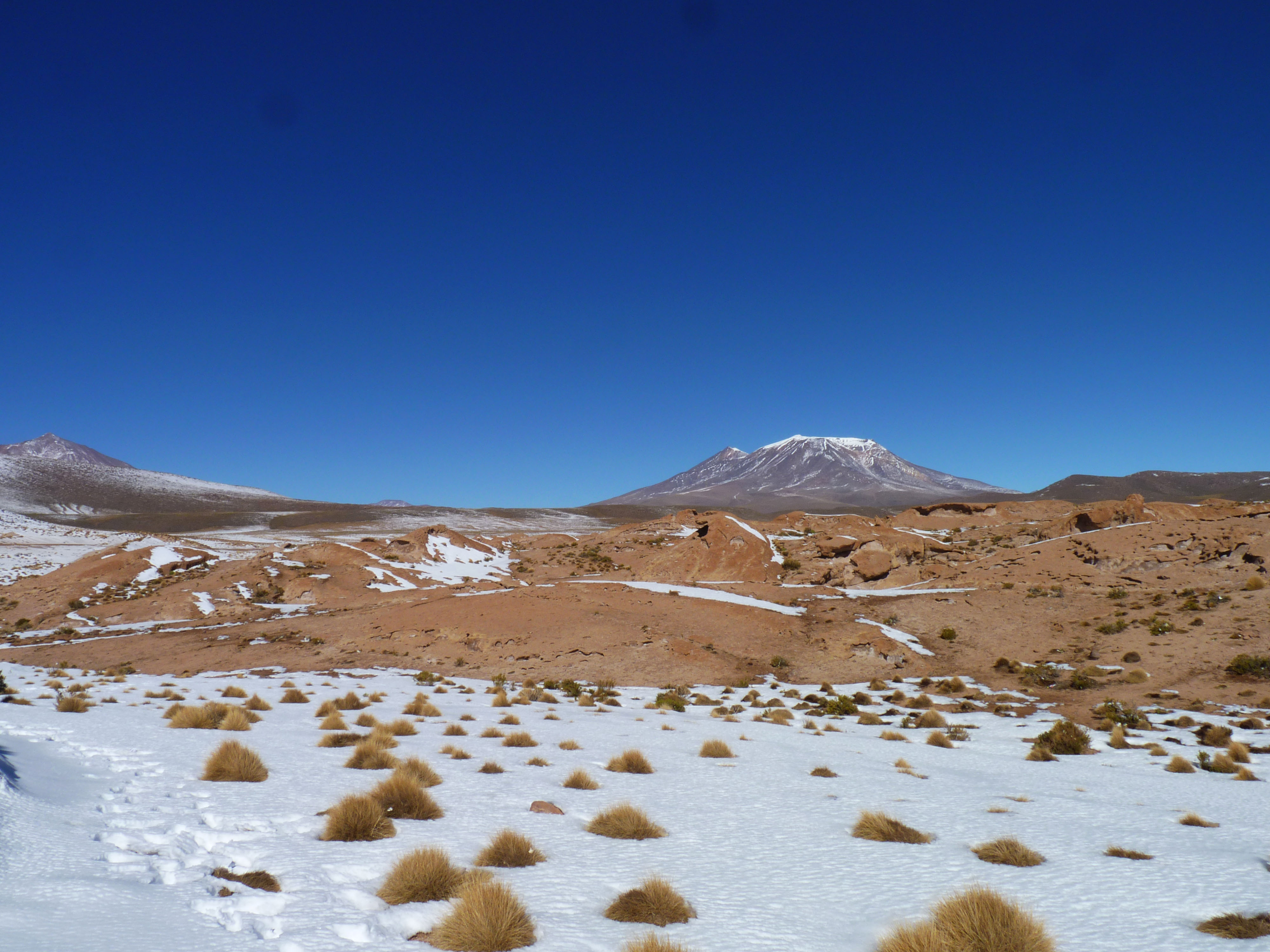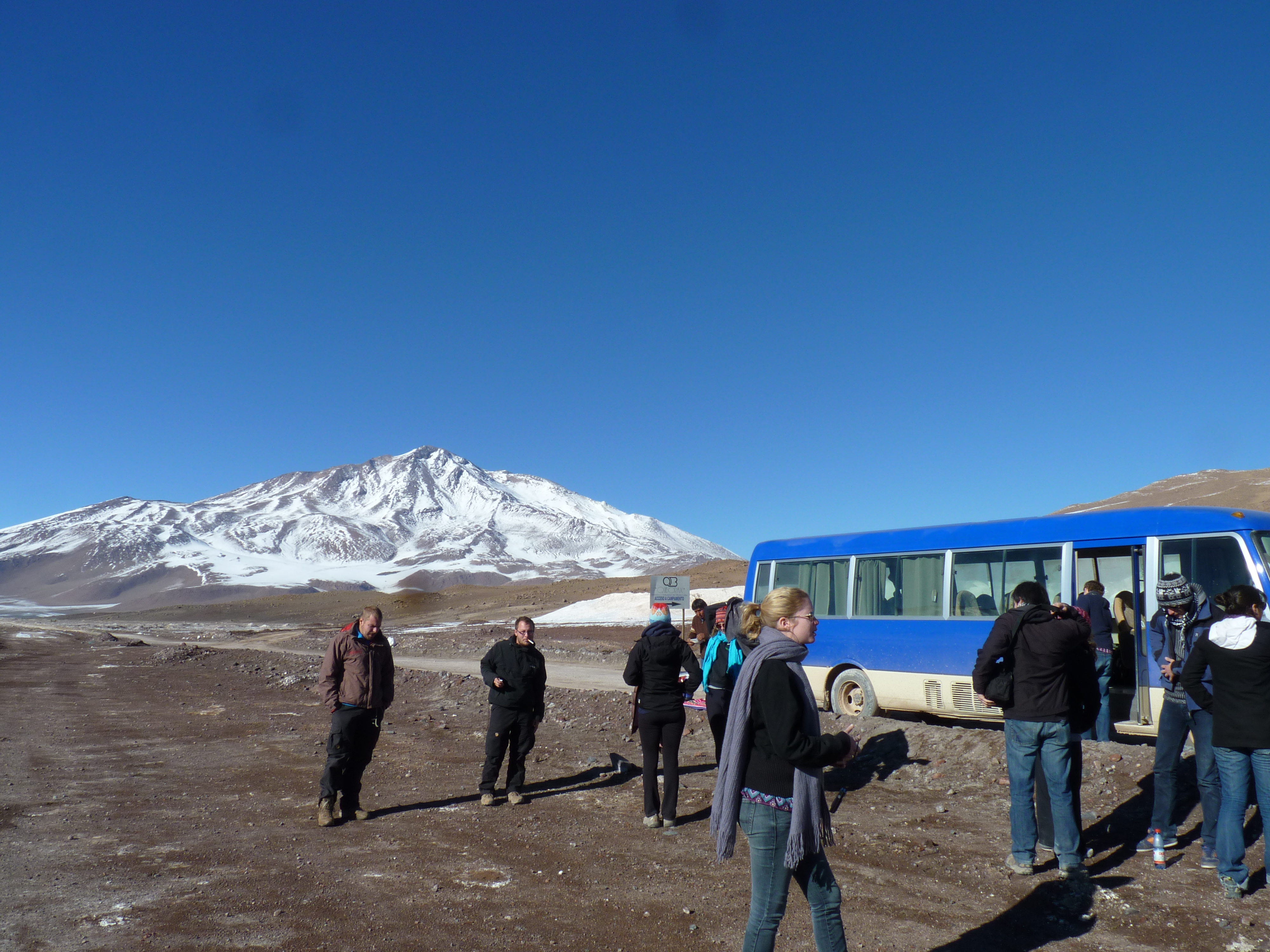 Somewhere in between Chile and Bolivia, we stopped for a mid morning picnic. We filed off, all twelve happy to have a few minutes to walk around without the jarring movement of the road. We munched on sandwiches, guzzled Nescafe, and played the getting-to-know-your-neighbor game among the mountains covered in icy snow. Not a terrible backdrop.